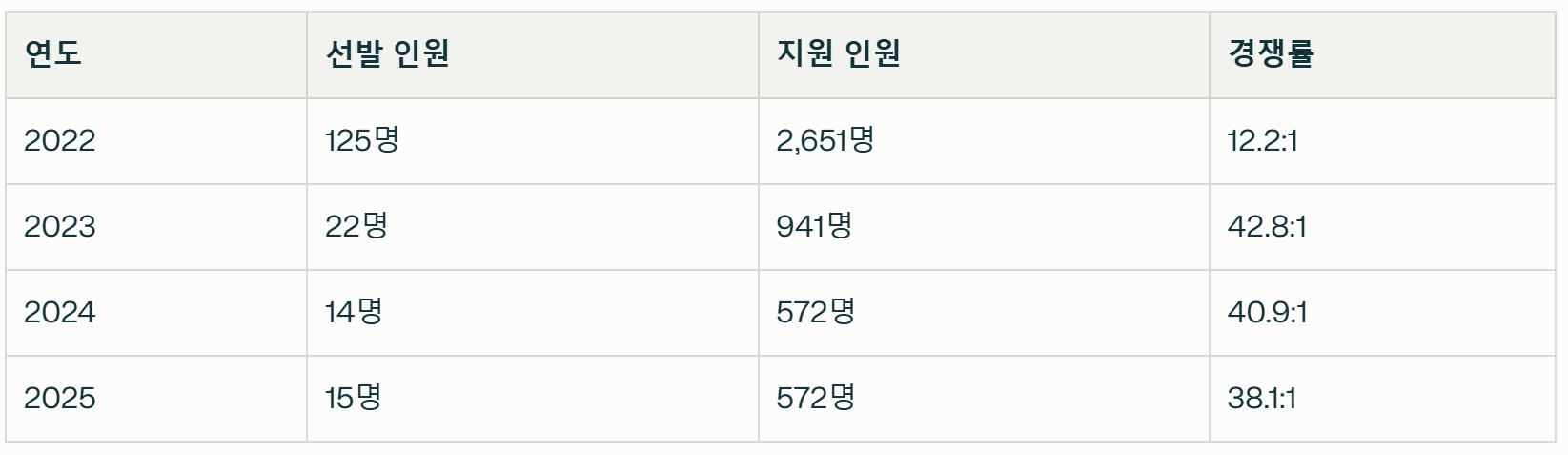 2024년 14명 선발, 572명 지원, 경쟁률 40.9:1,